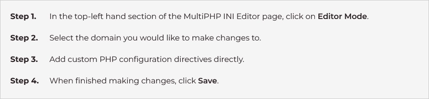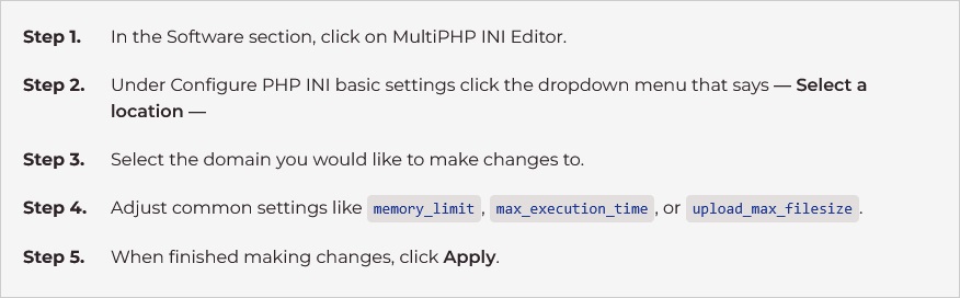 After upgrading your PHP version, you may need to adjust specific PHP settings to match your website’s requirements. The MultiPHP INI Editor in cPanel lets you make configuration changes to your PHP settings.