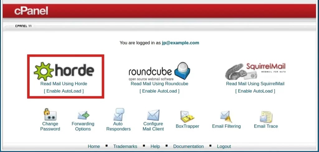 Step 3. You will log into Webmail and see three options. Click the Horde link to log in.